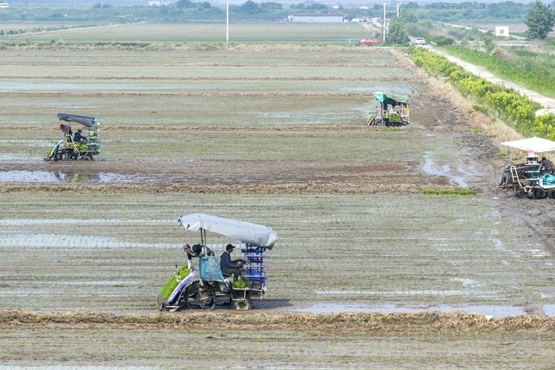 6月12日,在浙江省余姚市濱?,F(xiàn)代農(nóng)業(yè)先導(dǎo)區(qū),農(nóng)機手駕駛插秧機進行制種水稻插秧(無人機照片)。
