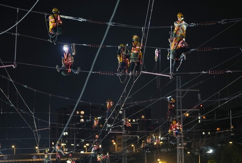 6月19日,在成渝中線高鐵成都站南北站場交替施工現(xiàn)場,中國中鐵電氣化局的施工人員在南站場進(jìn)行接觸網(wǎng)施工作業(yè)。