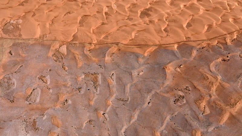 這是6月30日在寧夏中衛(wèi)市長流水村拍攝的騰格里沙漠東南緣治沙鎖邊工程現(xiàn)場(無人機(jī)照片)。