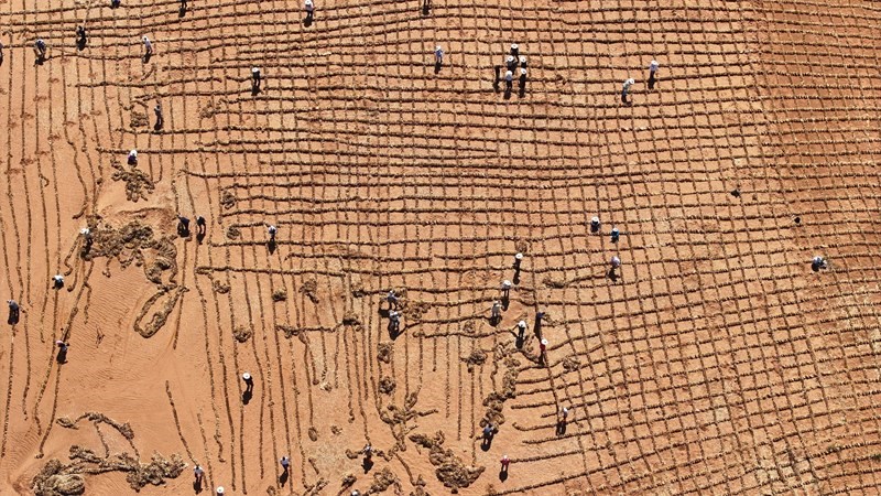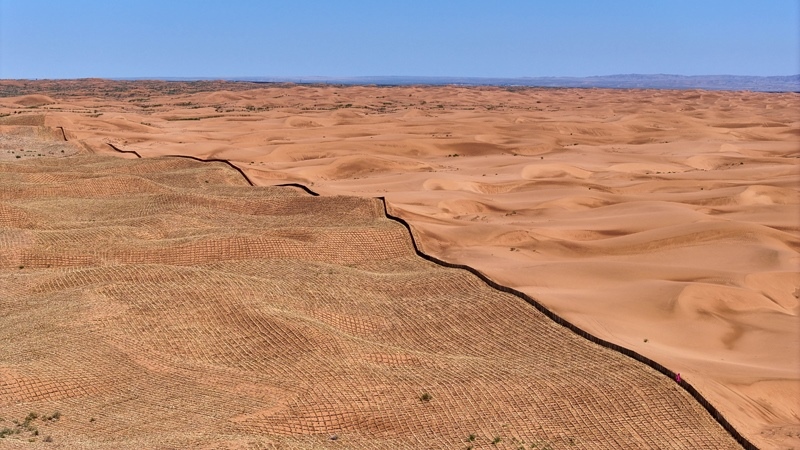 6月30日,在位于寧夏中衛(wèi)市長流水村的騰格里沙漠東南緣,隨著治沙工人將最后一列草方格穩(wěn)穩(wěn)扎下,這項跨越半個世紀(jì)的治沙工程,在騰格里沙漠寧夏境內(nèi)實現(xiàn)全面“鎖定”。一條長153公里、最寬處達(dá)38公里的固沙鎖邊帶蜿蜒開來。