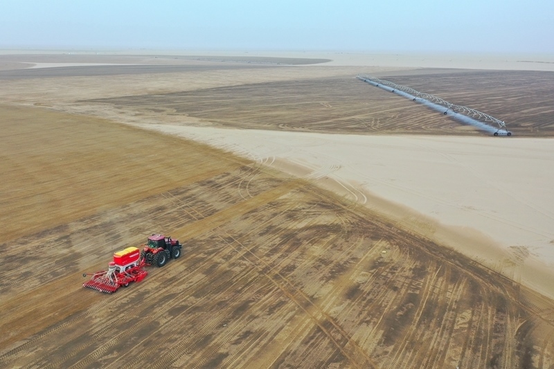 在新疆和田地區(qū)策勒縣4萬(wàn)畝苜蓿種植基地,農(nóng)機(jī)手駕駛機(jī)械在播種苜蓿(9月9日攝,無人機(jī)照片)。