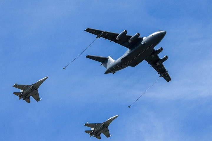 ↑9月19日,運(yùn)油-20A和殲-16編隊(duì)通場。新華社記者 顏麟蘊(yùn) 攝