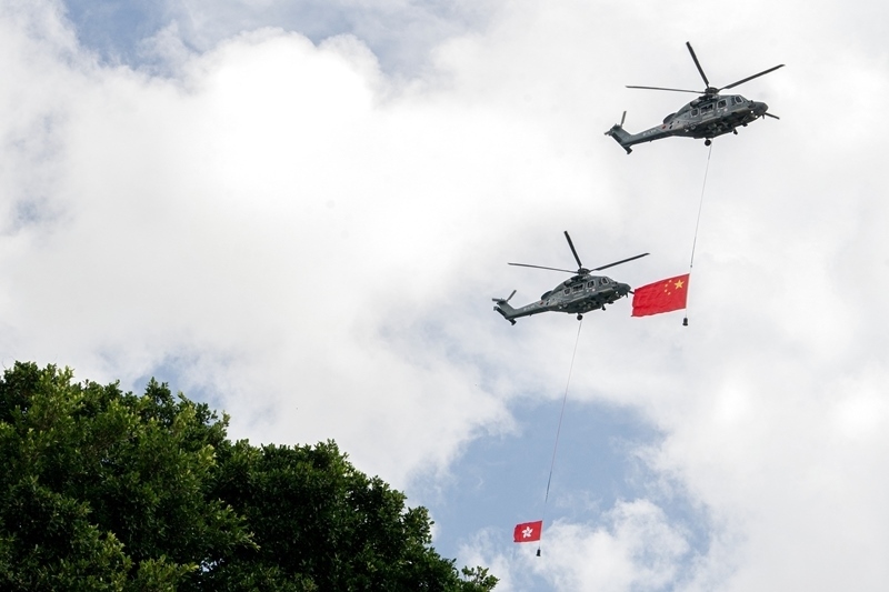 7月1日,香港特區(qū)政府在金紫荊廣場(chǎng)舉行升旗儀式,慶祝香港回歸祖國28周年。這是分別懸掛中華人民共和國國旗、香港特區(qū)區(qū)旗的直升機(jī)從空中飛過。