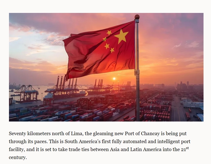 文章首先將目光投向在秘魯首都利馬以北70公里處的錢凱港。這個由中國和秘魯合作建設(shè)的嶄新港口,是南美洲首個全自動智能化港口設(shè)施,它將把亞洲與拉丁美洲的貿(mào)易關(guān)系帶入21世紀。隨著通往該港口的跨大陸公路和鐵路連接完工,錢凱港不僅要處理涉及南美洲太平洋沿岸的進出口貨物,也將處理從阿根廷、巴西和巴拉圭穿越太平洋運往中國的牛肉、大豆和小麥等貨物。