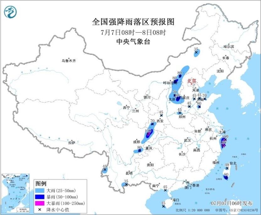 預(yù)計(jì),7月7日08時(shí)至8日08時(shí),浙江東部、內(nèi)蒙古中部、山西中北部、河北西北部和西南部、山東北部、河南西北部、陜西西南部、四川東部、云南西南部、臺(tái)灣島等地部分地區(qū)有大到暴雨,其中,浙江東部、四川東部等地部分地區(qū)有大暴雨(100~180毫米)。上述部分地區(qū)伴有短時(shí)強(qiáng)降水(最大小時(shí)降雨量20~50毫米,局地可超過(guò)70毫米),局地有雷暴大風(fēng)等強(qiáng)對(duì)流天氣。中央氣象臺(tái)7月7日06時(shí)繼續(xù)發(fā)布暴雨藍(lán)色預(yù)警。