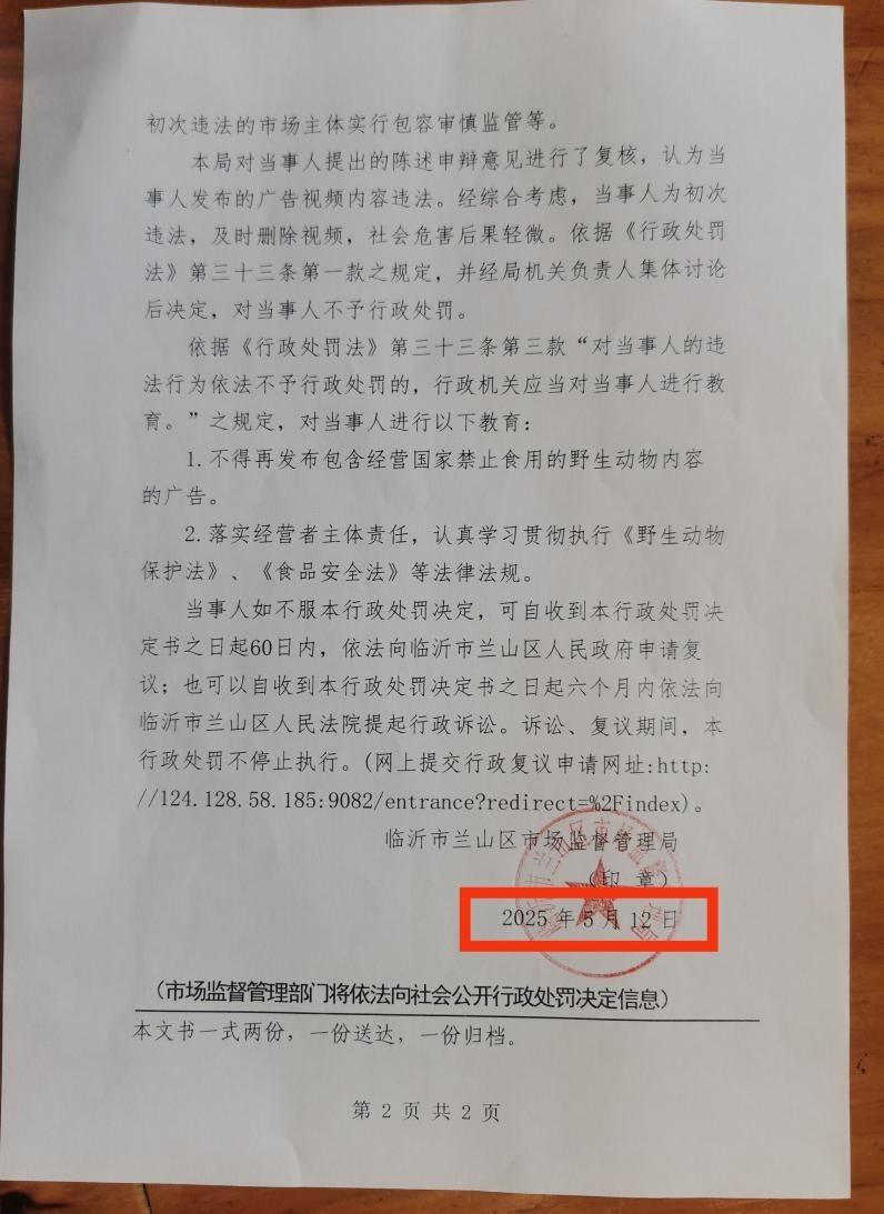負(fù)責(zé)代理此案的龔華律師告訴記者,今晨七點(diǎn),蘭山區(qū)市場(chǎng)監(jiān)管局工作人員到飯館送達(dá)《不予行政處罰決定書》,落款日期為5月12日,并要求當(dāng)事人簽署送達(dá)回執(zhí)。