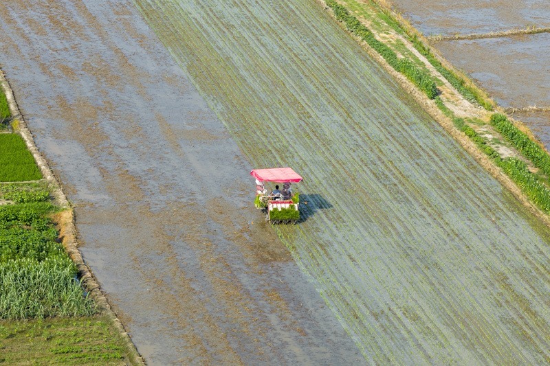 7月15日,在湖南省衡陽市衡山縣福田鋪鄉(xiāng),村民駕駛農機進行晚稻插秧工作(無人機照片)。