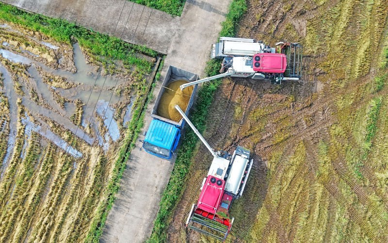 7月15日,在浙江省臺州市仙居縣下各鎮(zhèn),農民將剛收割的稻谷裝車(無人機照片)。