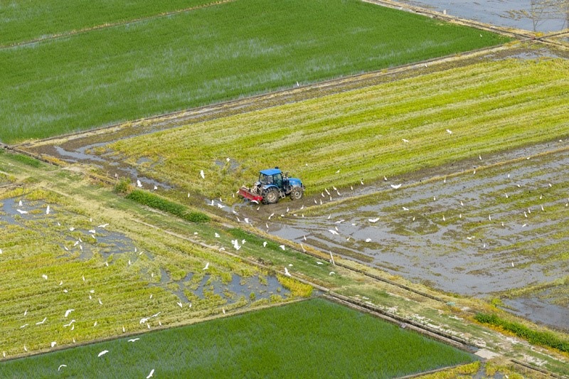 7月14日,在浙江省余姚市黃家埠鎮(zhèn)五車堰村,農民駕駛農機翻耕農田(無人機照片)。