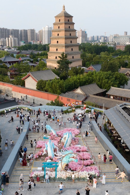 游客在位于西安大雁塔附近的大悅城觀景平臺上游玩拍照(7月16日攝,無人機照片)。