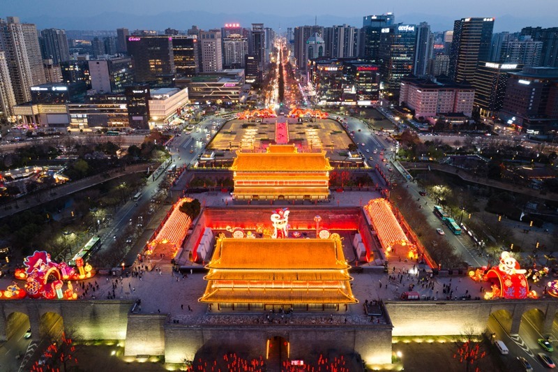 西安南門商圈夜景(3月19日攝,無人機照片)。