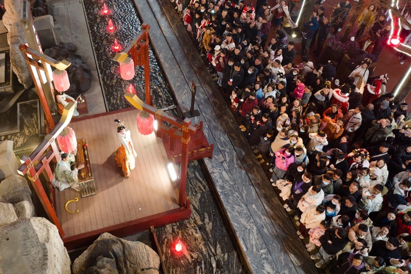 游客在西安大唐不夜城街區(qū)觀看以唐代歷史文化為背景創(chuàng)作的情景?。?月22日攝,無人機照片)。