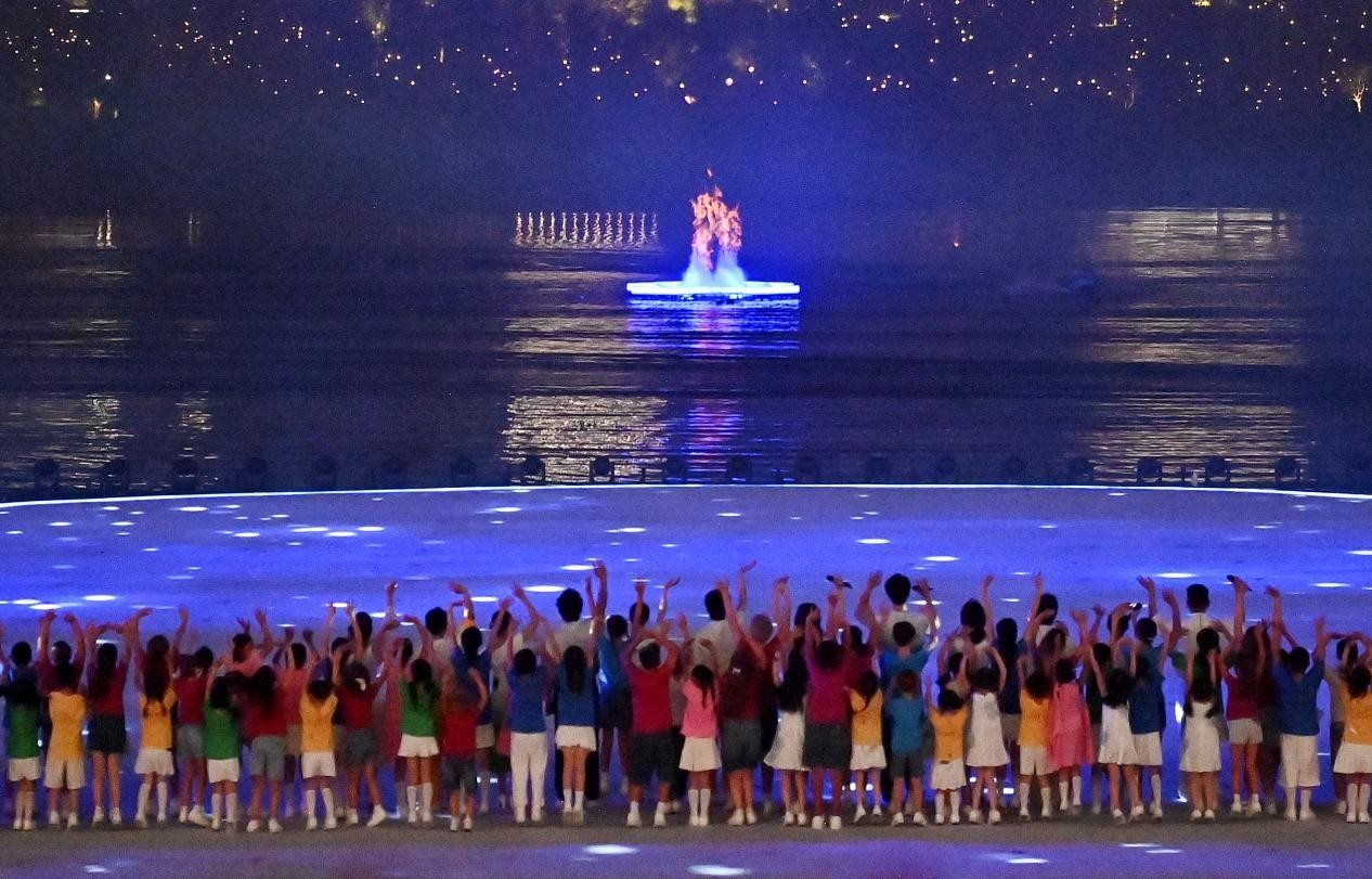 宣布開幕瞬間,象征世運(yùn)會(huì)會(huì)徽和“World”的“W”造型焰火點(diǎn)亮夜空;極具創(chuàng)意和挑戰(zhàn)的點(diǎn)火儀式,火炬“竹夢”成功點(diǎn)燃世運(yùn)會(huì)首個(gè)“水火相融”于湖中的火炬塔,絢爛的火焰交相輝映。