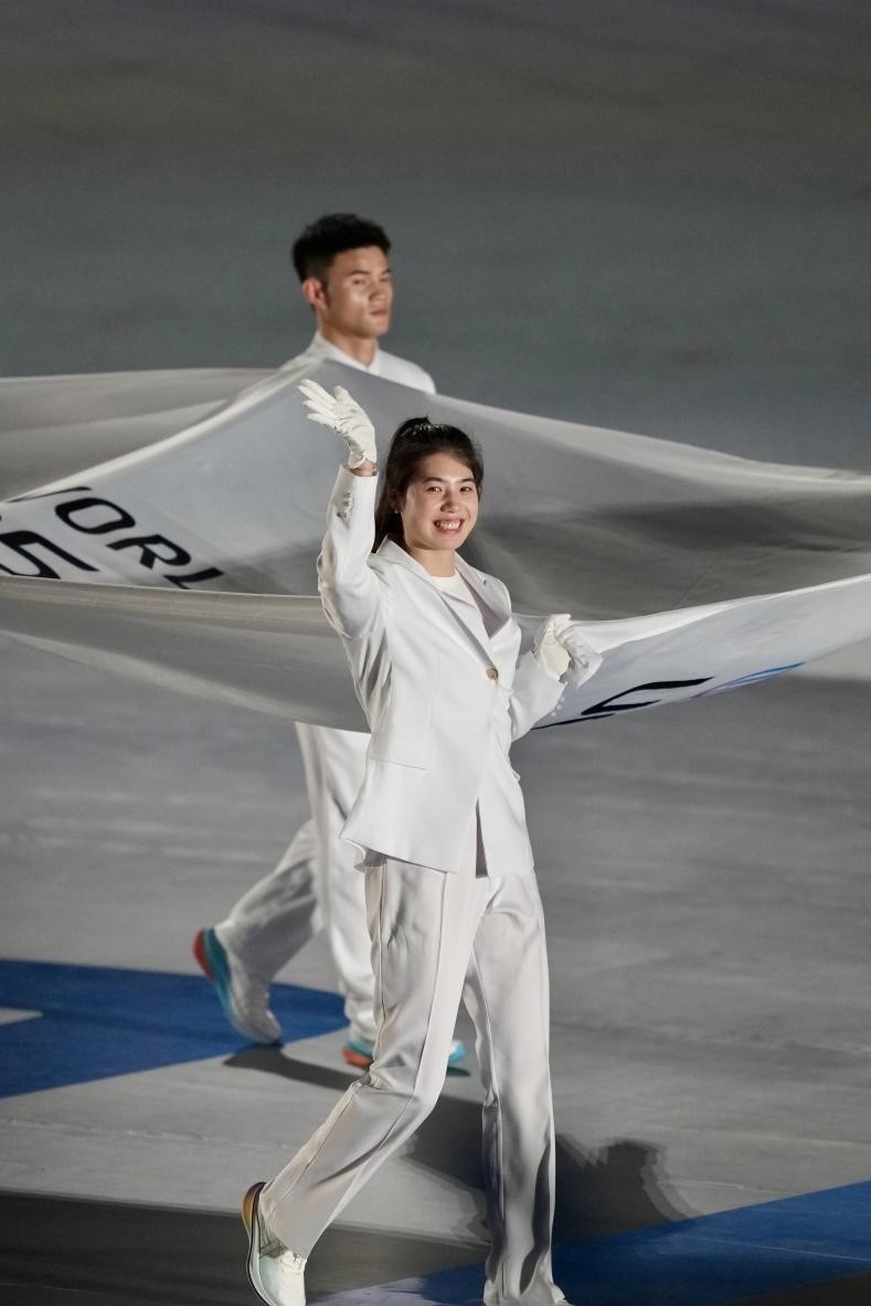 開幕式在《繽紛之約》表演中拉開序幕,街舞與輪滑、滑板、啦啦操等運(yùn)動(dòng)元素碰撞出青春火花激情開場。倒計(jì)時(shí)焰火組成的篆體“成都”字樣,將傳統(tǒng)文化與現(xiàn)代科技巧妙結(jié)合。來自全球的運(yùn)動(dòng)員在吉祥物“蜀寶”“錦仔”的歡迎下入場,手持融入蜀繡、漆藝等非遺工藝的引導(dǎo)牌,踏上榮耀之路。