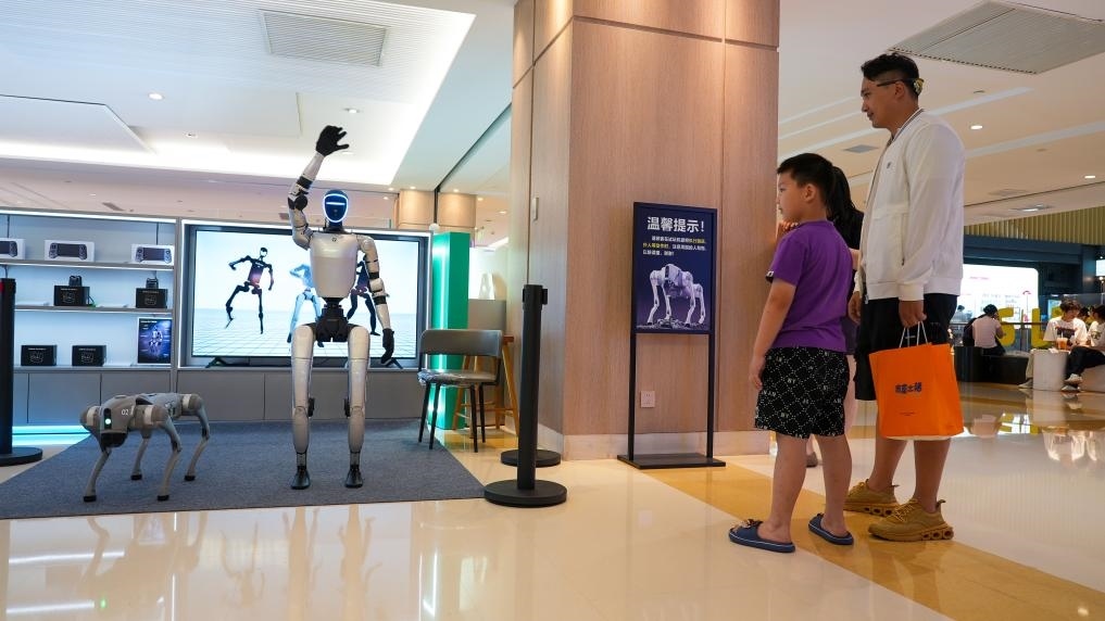 顧客在丹尼斯大衛(wèi)城等待操作智能機(jī)器人和機(jī)器狗。新華社記者劉振坤 攝