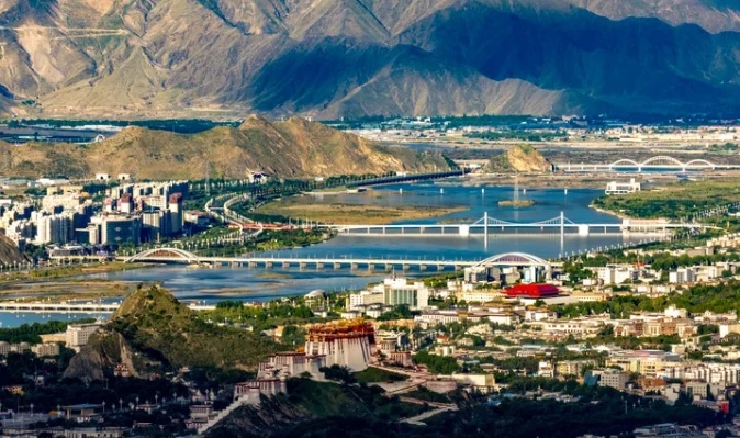 這是2025年7月30日拍攝的拉薩河風(fēng)光,由近及遠分別是連心橋、柳梧大橋、和美橋和青藏鐵路拉薩河特大橋。新華社記者 姜帆 攝