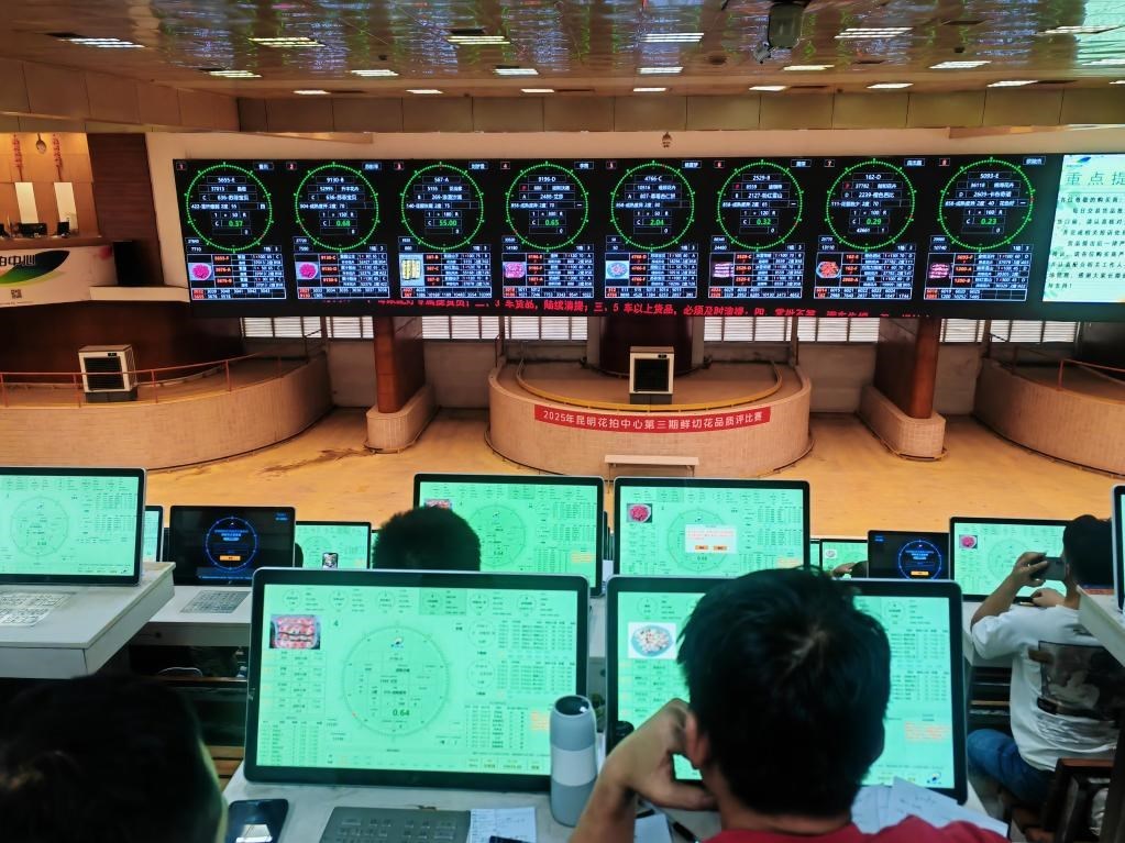 記者在昆明國際花卉拍賣交易中心看到,拍賣大鐘界面顯示著各種花卉的信息,數(shù)百名購買商操作著競價器選購鮮花。昆明國際花卉拍賣交易中心副總經(jīng)理汪洋介紹,這里每天的鮮花交易量都超700萬枝,單日最高交易量超1100萬枝,30%以上的鮮花被各大電商和直播團隊拍下,他們再拿到電商平臺或直播間銷售。