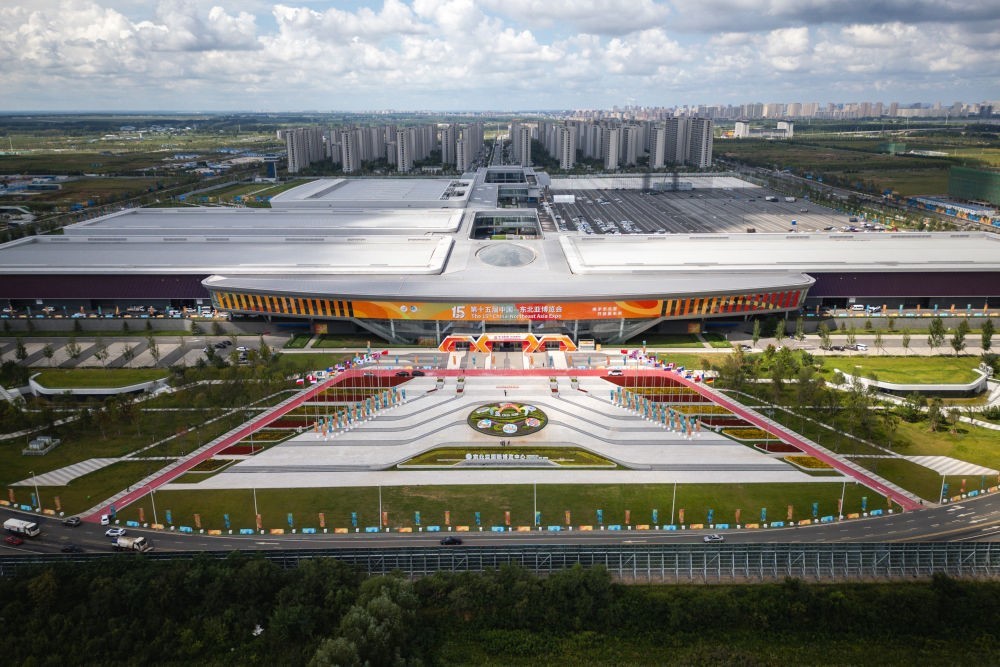 這是2025年8月26日拍攝的第十五屆中國—東北亞博覽會展館外景(無人機(jī)照片)。新華社記者 許暢 攝