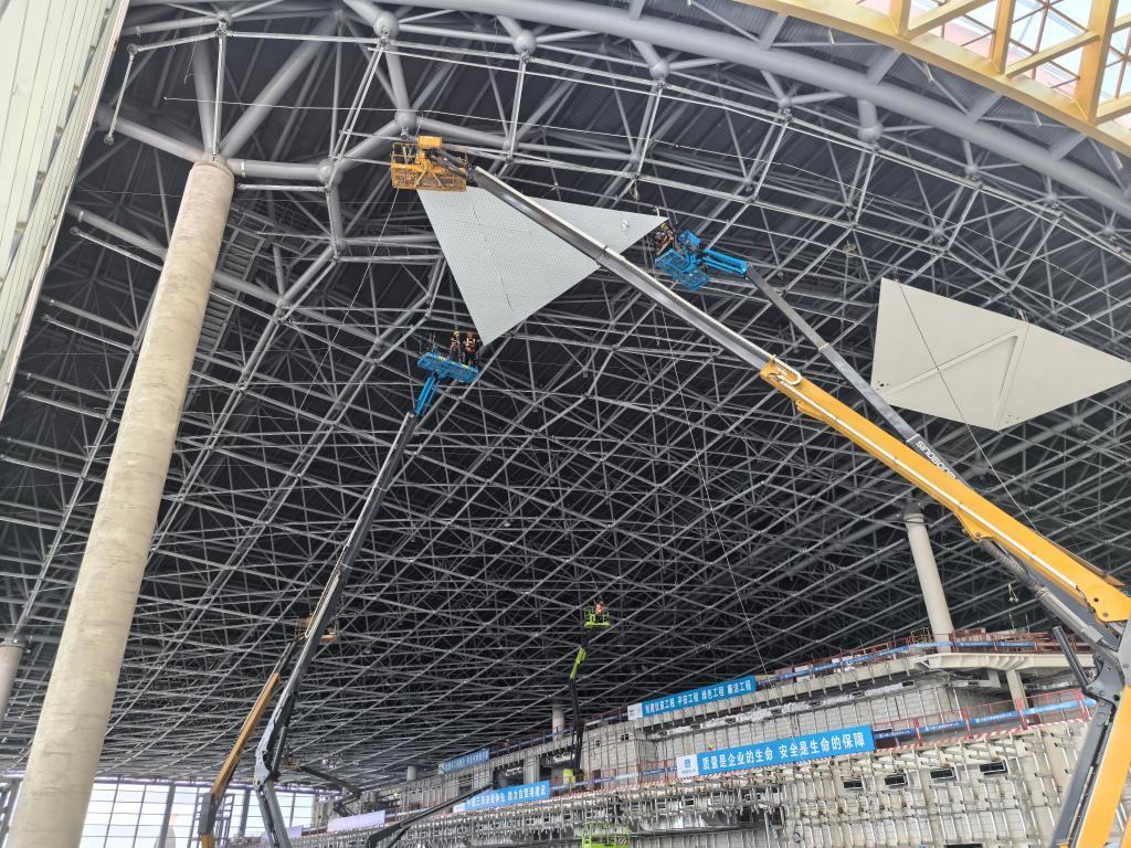 工人正在對T3航站樓進行室內裝飾裝修。(中建三局供圖)
