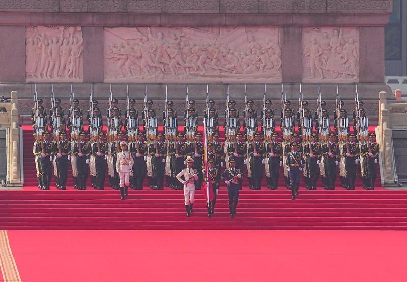 9月3日,紀(jì)念中國人民抗日戰(zhàn)爭(zhēng)暨世界反法西斯戰(zhàn)爭(zhēng)勝利80周年大會(huì)在北京隆重舉行。這是國旗護(hù)衛(wèi)隊(duì)官兵護(hù)衛(wèi)著五星紅旗,從人民英雄紀(jì)念碑行進(jìn)至廣場(chǎng)北側(cè)升旗區(qū)。