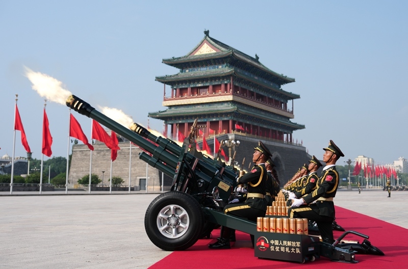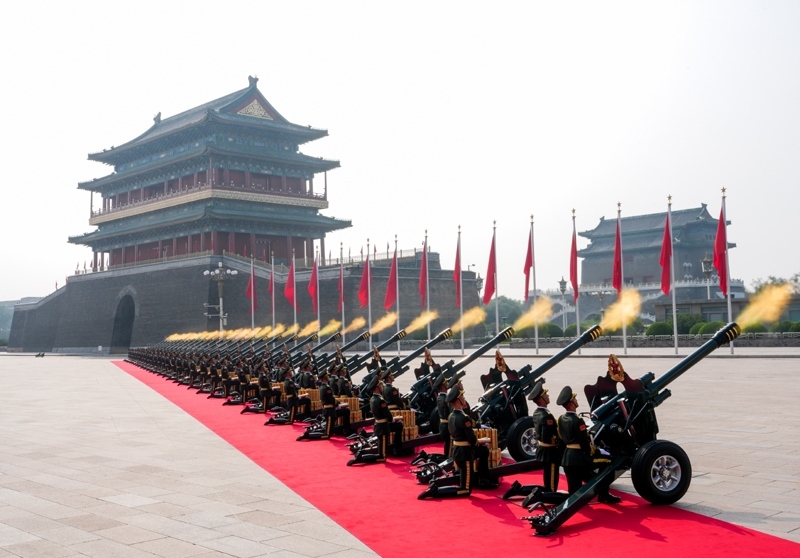 9月3日,紀(jì)念中國人民抗日戰(zhàn)爭(zhēng)暨世界反法西斯戰(zhàn)爭(zhēng)勝利80周年大會(huì)在北京隆重舉行。這是禮炮在天安門廣場(chǎng)鳴響。