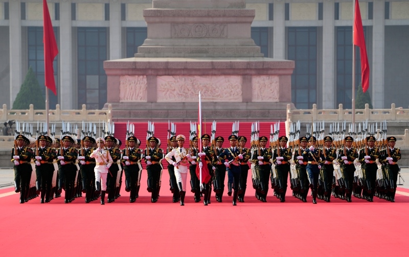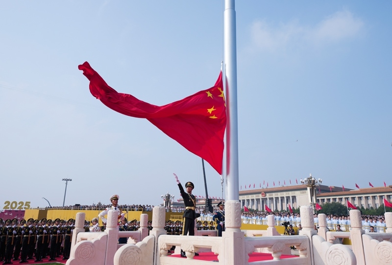 9月3日,紀(jì)念中國人民抗日戰(zhàn)爭(zhēng)暨世界反法西斯戰(zhàn)爭(zhēng)勝利80周年大會(huì)在北京隆重舉行。這是國旗護(hù)衛(wèi)隊(duì)從人民英雄紀(jì)念碑基座出發(fā),走向旗桿基座。
