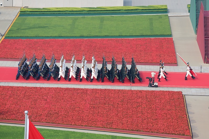 9月3日,紀(jì)念中國人民抗日戰(zhàn)爭(zhēng)暨世界反法西斯戰(zhàn)爭(zhēng)勝利80周年大會(huì)在北京天安門廣場(chǎng)隆重舉行。這是國旗護(hù)衛(wèi)隊(duì)從人民英雄紀(jì)念碑基座出發(fā),走向旗桿基座。