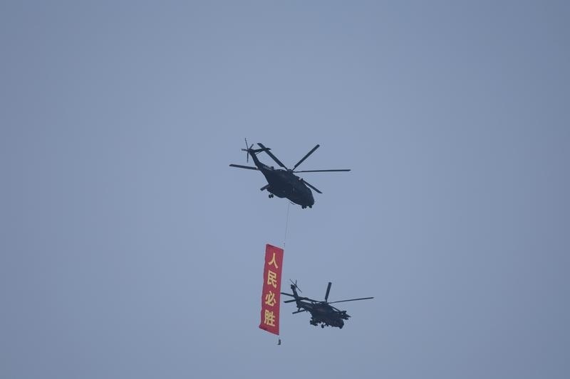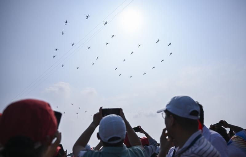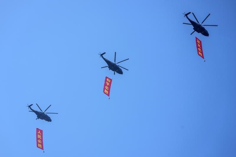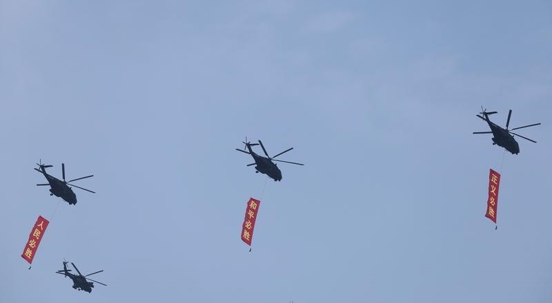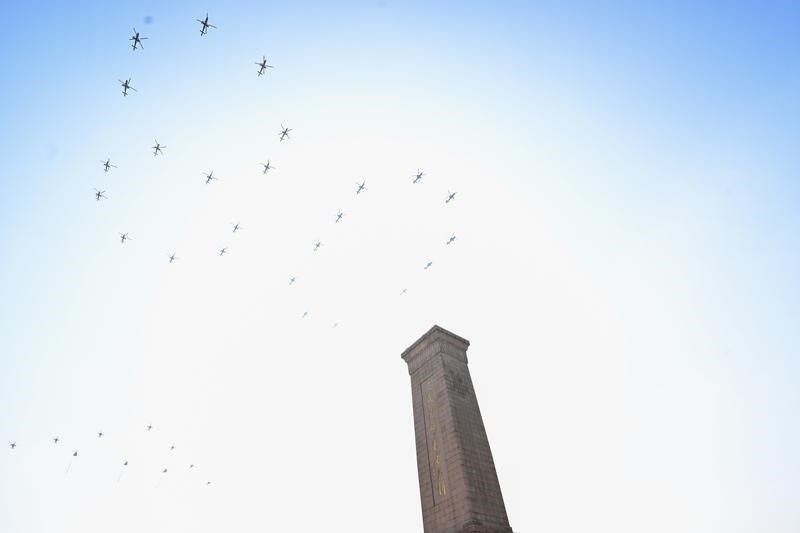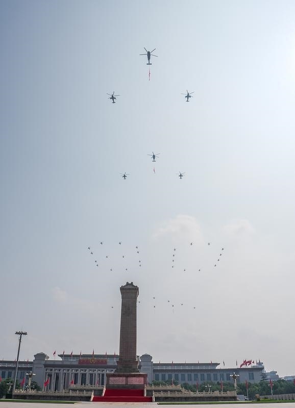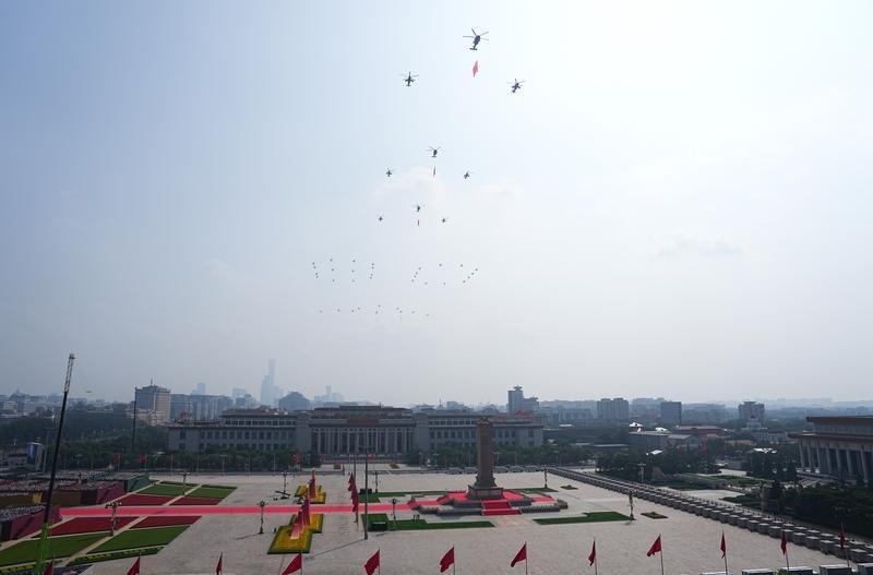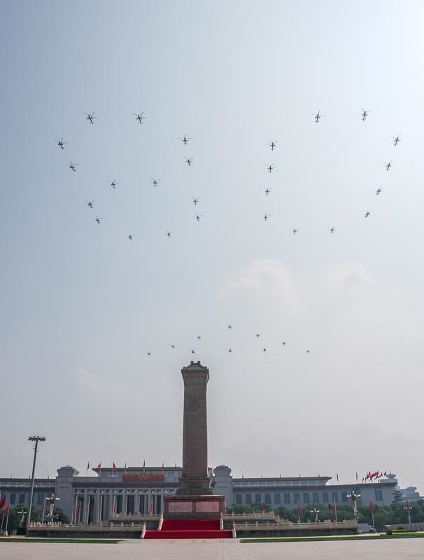 9月3日,紀(jì)念中國(guó)人民抗日戰(zhàn)爭(zhēng)暨世界反法西斯戰(zhàn)爭(zhēng)勝利80周年大會(huì)在北京隆重舉行。這是空中護(hù)旗梯隊(duì)飛過(guò)天安門(mén)廣場(chǎng)上空,26架直升機(jī)匯成巨大的“80”字樣。