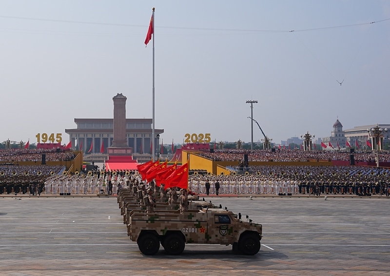 9月3日,紀(jì)念中國人民抗日戰(zhàn)爭暨世界反法西斯戰(zhàn)爭勝利80周年大會在北京隆重舉行。這是戰(zhàn)旗方隊行進在長安街上。