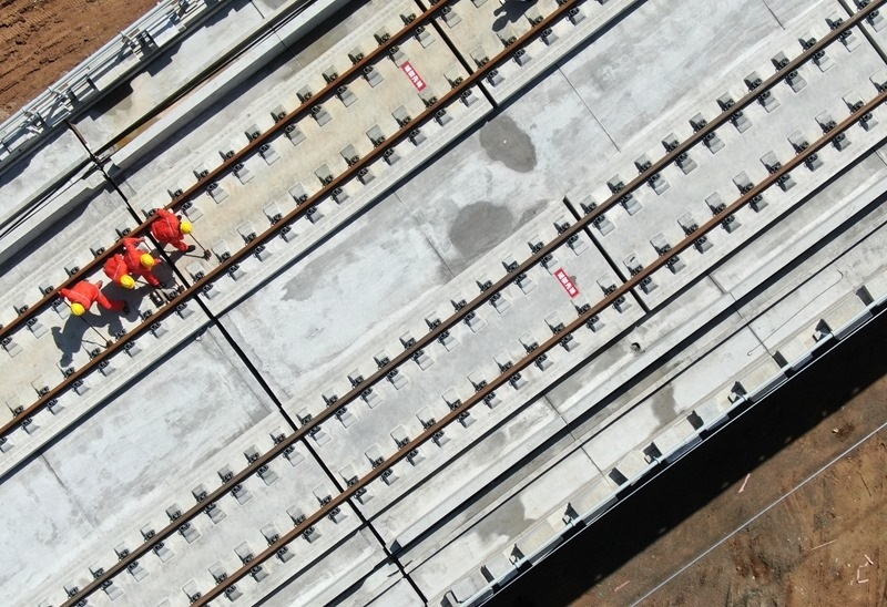 9月8日,施工人員在西十高鐵西安東至藍(lán)田區(qū)間鋪設(shè)無縫鋼軌(無人機(jī)照片)。