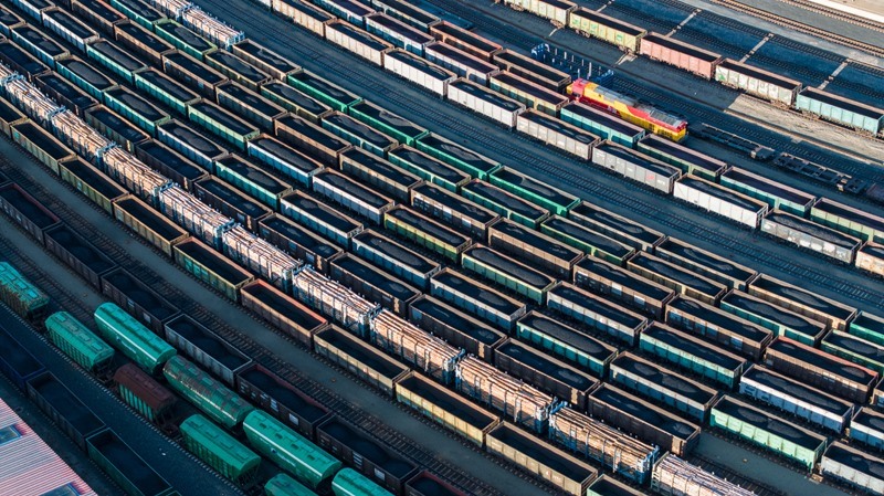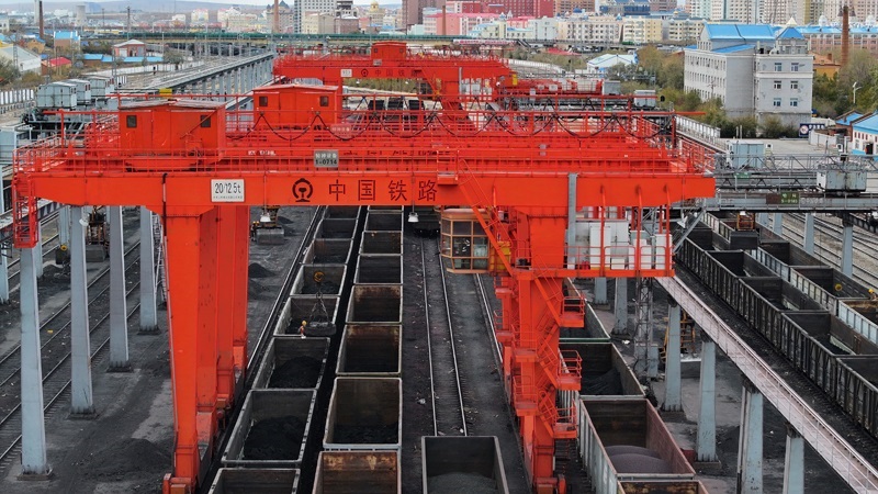 10月18日,在中國鐵路哈爾濱局集團(tuán)有限公司綏芬河站南場,滿載進(jìn)口貨物的列車等待解體換裝(無人機照片)。
