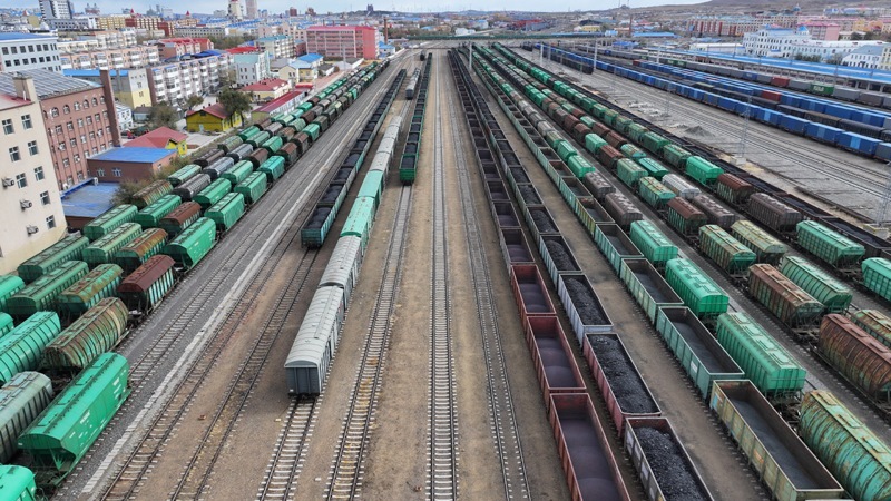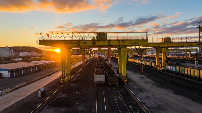 10月18日,一列滿載進(jìn)口物資的貨物列車駛向中國鐵路哈爾濱局集團(tuán)有限公司綏芬河站(無人機照片)。