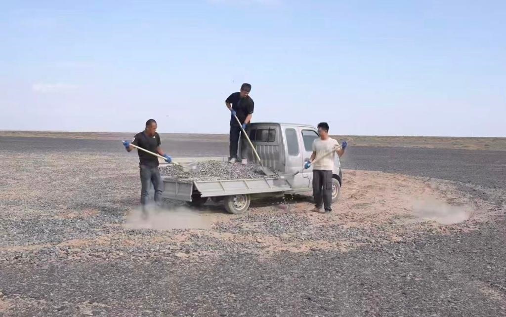 “看到車(chē)輪碾過(guò)標(biāo)語(yǔ)那一刻,就像碾在歷史的脊梁上?!本W(wǎng)絡(luò)博主陸遙得知標(biāo)語(yǔ)被破壞后,主動(dòng)驅(qū)車(chē)兩千多公里,經(jīng)歷六天抵達(dá)哈密。他和朋友們拉運(yùn)20噸砂石,才終于修復(fù)這些“疤痕”。