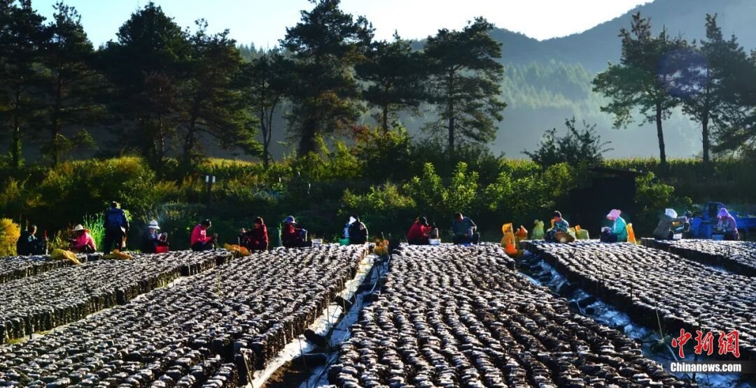 (夕陽(yáng)下,菌農(nóng)們正在采摘。黃松甸鎮(zhèn)供圖)