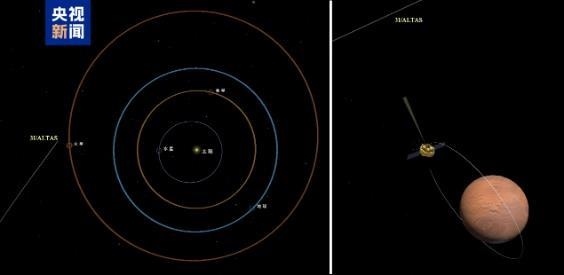 △星際天體阿特拉斯與天問一號(hào)火星環(huán)繞器相對位置示意圖(右圖是2025年10月3日相機(jī)拍攝時(shí)左圖的局部放大)