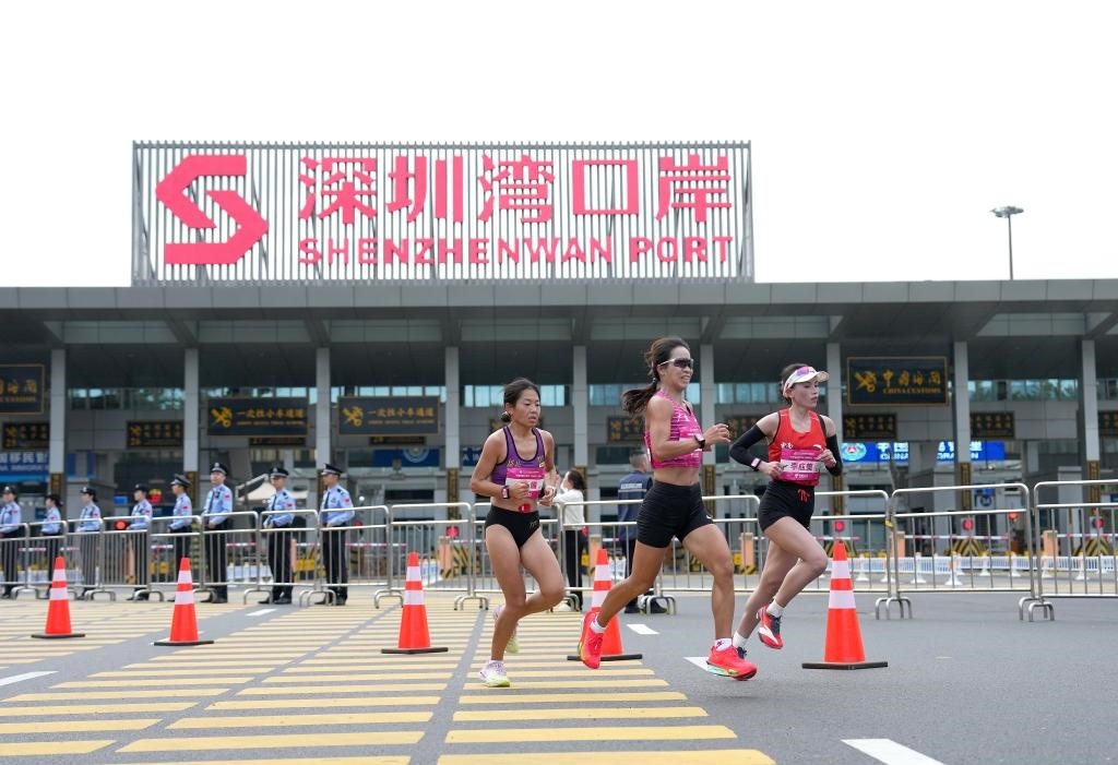 11月15日,第十五屆全國運(yùn)動會田徑項(xiàng)目女子馬拉松比賽參賽選手經(jīng)過深圳灣口岸。新華社記者 丁增尼達(dá) 攝