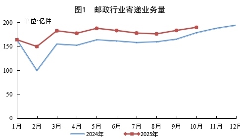 10月份,郵政行業(yè)寄遞業(yè)務量完成189.9億件,同比增長6.5%。其中,快遞業(yè)務量完成176.0億件,同比增長7.9%。