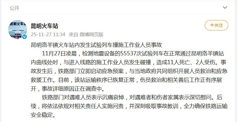 據(jù)昆明鐵路局昆明站官方微博消息,11月27日凌晨,檢測(cè)地震設(shè)備的55537次試驗(yàn)列車(chē)在正常通過(guò)昆明洛羊鎮(zhèn)站內(nèi)曲線(xiàn)處時(shí),與進(jìn)入線(xiàn)路的施工作業(yè)人員發(fā)生碰撞,造成11人死亡、2人受傷。事故發(fā)生后,鐵路部門(mén)立即啟動(dòng)應(yīng)急預(yù)案,與當(dāng)?shù)卣餐M織開(kāi)展人員救治和應(yīng)急救援工作。目前,該站運(yùn)輸秩序已恢復(fù)正常,傷員救治和相關(guān)善后工作正有序展開(kāi),事故詳細(xì)原因正在調(diào)查中。