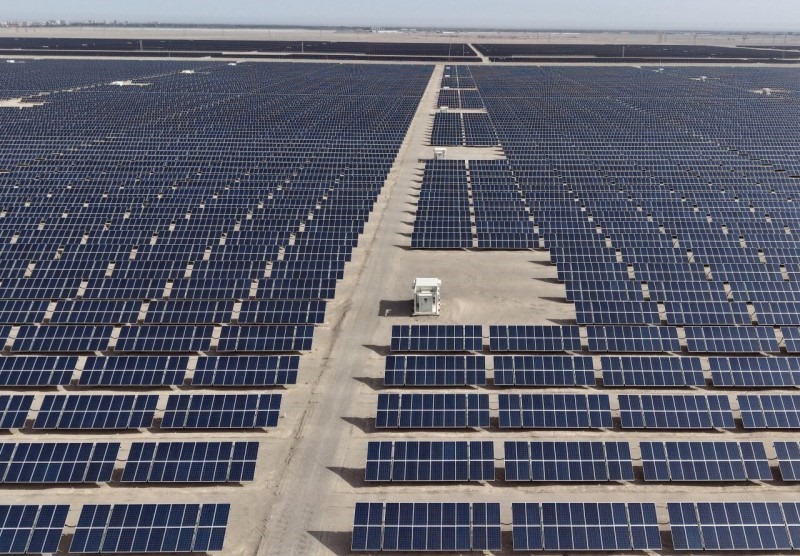 位于塔克拉瑪干沙漠北緣的新疆生產(chǎn)建設(shè)兵團(tuán)第一師實(shí)施光伏治沙項目,阻擋沙漠推進(jìn)。王志清 攝