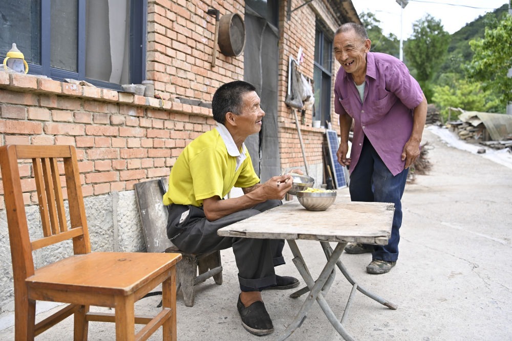 ↑村民元有才(右)為秦海松準(zhǔn)備好午餐后,兩人開(kāi)心交流(2025年8月6日攝)。
