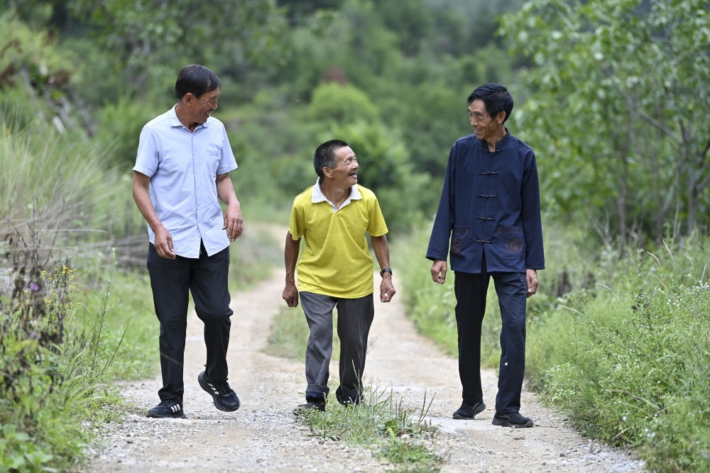 ↑村干部申廣軍(左)、村民桑建國(guó)(右)送秦海松到照顧他的下一戶村民家(2025年8月6日攝)。