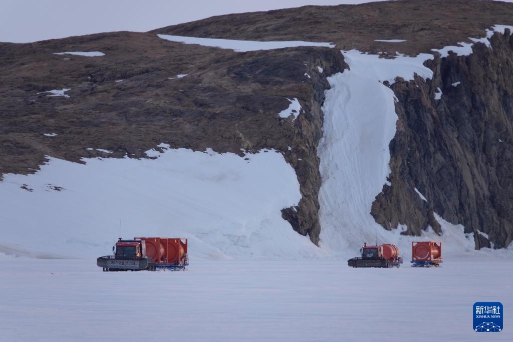 北京時(shí)間12月3日凌晨,從中山站和內(nèi)陸出發(fā)基地駛來(lái)的雪地車?yán)沼凸薜纸把?”號(hào)。新華社記者 顧天成 攝