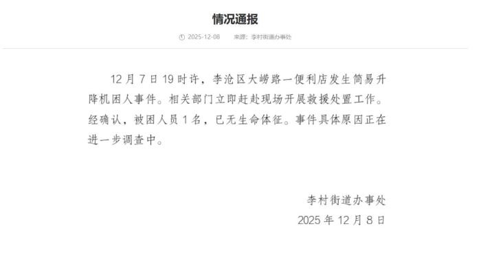 中新網(wǎng)12月8日電 青島李村街道辦事處8日在青島李滄政務(wù)網(wǎng)發(fā)布情況通報(bào)稱,12月7日19時許,李滄區(qū)大嶗路一便利店發(fā)生簡易升降機(jī)困人事件。相關(guān)部門立即趕赴現(xiàn)場開展救援處置工作。經(jīng)確認(rèn),被困人員1名,已無生命體征。事件具體原因正在進(jìn)一步調(diào)查中。