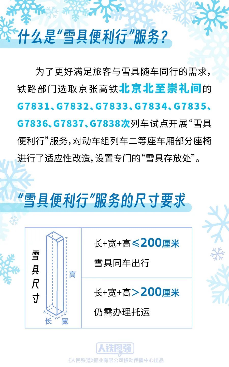 鐵路部門(mén)堅(jiān)持以人民為中心的發(fā)展思想,持續(xù)深化運(yùn)輸供給側(cè)結(jié)構(gòu)性改革,積極適應(yīng)旅客多樣化的出行需求,為攜帶雪具出行的旅客提供便捷服務(wù)。前期,鐵路部門(mén)按照《國(guó)鐵集團(tuán)鐵路旅客運(yùn)輸規(guī)程》“旅客乘坐動(dòng)車組列車隨身攜帶的行李物品長(zhǎng)、寬、高之和不超過(guò)130厘米”的規(guī)定,對(duì)超過(guò)上述尺寸標(biāo)準(zhǔn)的雪具推出了“雪具快運(yùn)”服務(wù)。為了更好滿足旅客與雪具隨車同行的需求,鐵路部門(mén)統(tǒng)籌考慮旅客安全、乘車秩序和雪具運(yùn)輸需求,選取京張高鐵北京北至崇禮間的G7831、G7832、G7833、G7834、G7835、G7836、G7837、G7838次列車試點(diǎn)開(kāi)展“雪具便利行”服務(wù),對(duì)動(dòng)車組列車二等座車廂部分座椅進(jìn)行了適應(yīng)性改造,設(shè)置專門(mén)的“雪具存放處”,旅客選擇該服務(wù)后可攜帶長(zhǎng)、寬、高之和不超過(guò)200厘米的雪具同車出行,滑雪更加方便快捷。對(duì)于長(zhǎng)、寬、高之和超過(guò)200厘米的雪具,由于高鐵列車車內(nèi)空間限制,仍需辦理托運(yùn)。