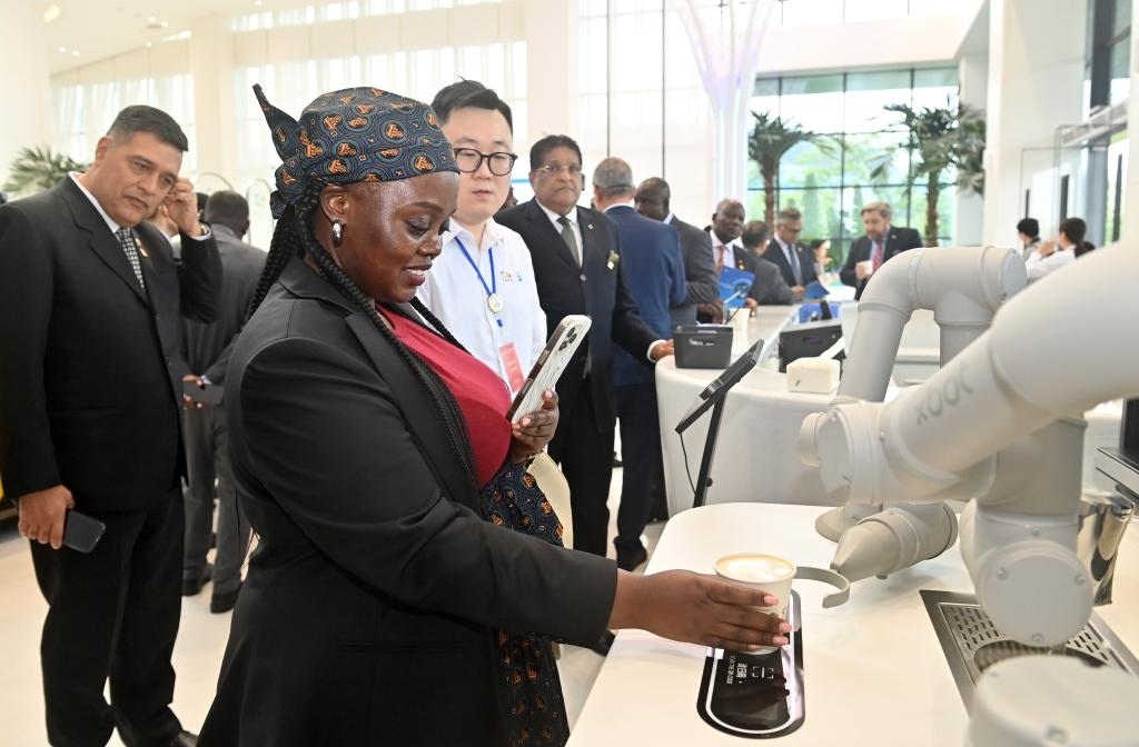 10月29日,駐華使節(jié)代表團(tuán)在中國-東盟國家人工智能應(yīng)用合作中心參觀體驗機(jī)器人制作咖啡。新華社記者 陸波岸 攝