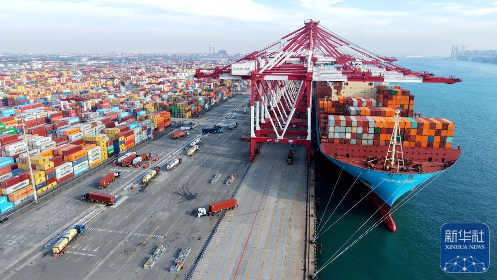 ↑ 12月15日,在山東港口青島港,貨輪在裝卸外貿(mào)集裝箱(無人機照片)。新華社發(fā)(俞方平攝)