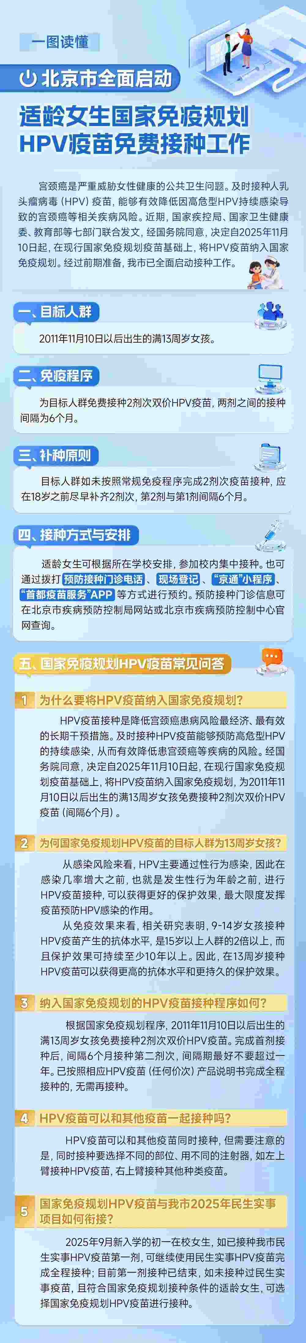 適齡女生可根據(jù)所在學(xué)校安排,參加校內(nèi)集中接種,也可通過(guò)撥打預(yù)防接種門診電話、現(xiàn)場(chǎng)登記、“京通”小程序、“首都疫苗服務(wù)”App等方式預(yù)約。預(yù)防接種門診信息可在北京市疾病預(yù)防控制局網(wǎng)站或北京市疾病預(yù)防控制中心官網(wǎng)查詢。