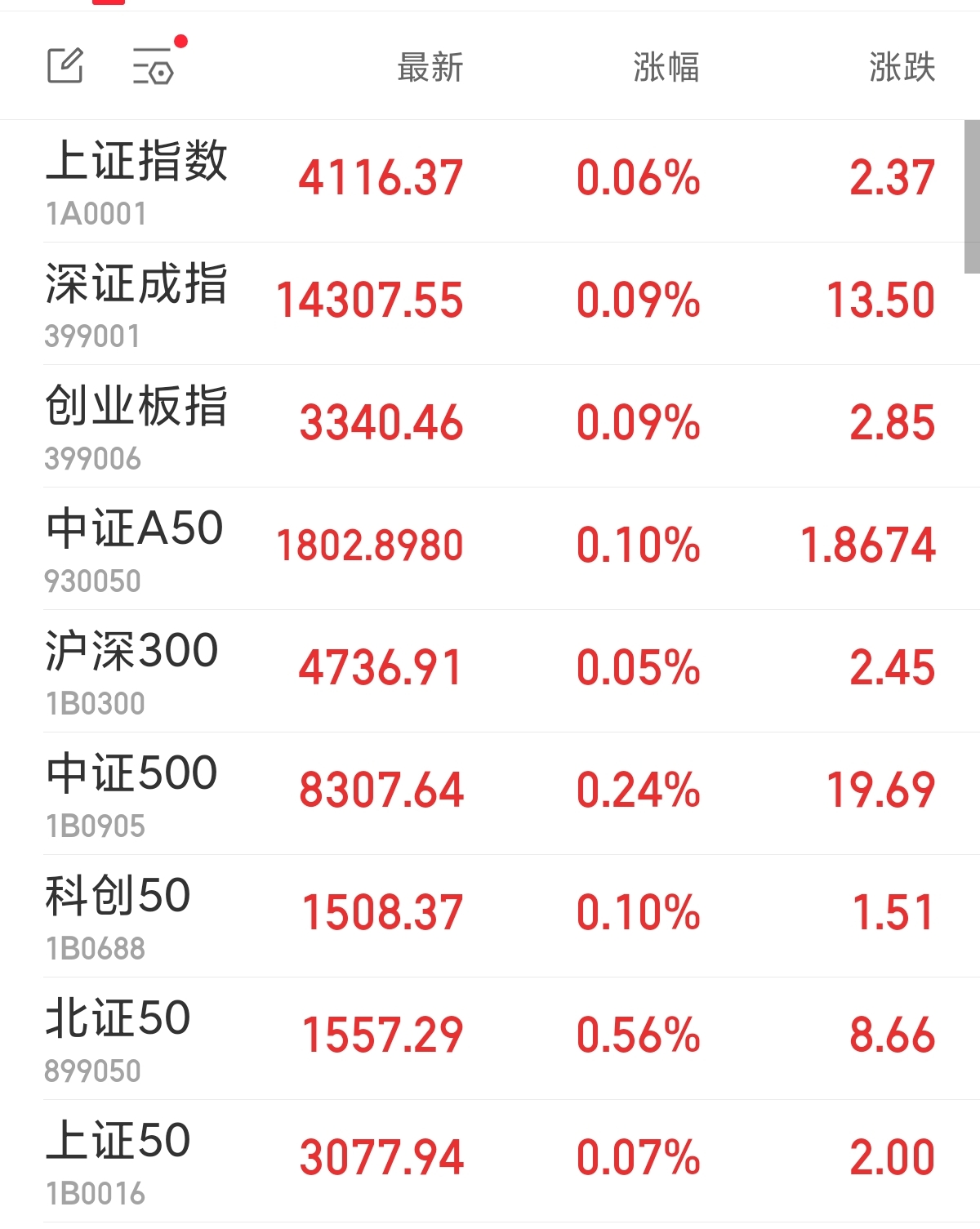 中新經(jīng)緯1月20日電 周二,A股三大指數(shù)集體高開。上證指數(shù)漲0.06%,報(bào)4116.37點(diǎn);深證成指漲0.09%,報(bào)14307.55點(diǎn);創(chuàng)業(yè)板指漲0.09%,報(bào)3340.46點(diǎn)。