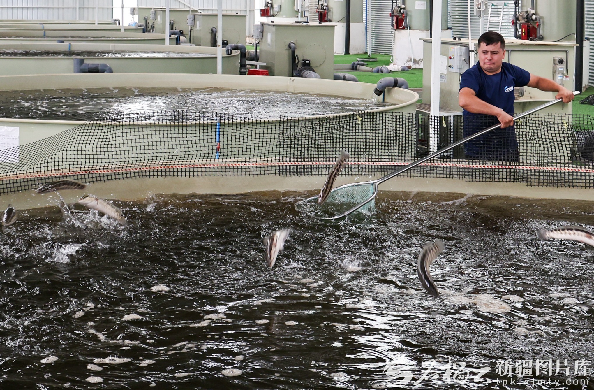 和田域見疆來水產(chǎn)養(yǎng)殖有限責(zé)任公司員工在對養(yǎng)殖池的黑魚進行捕撈。許曉龍攝(資料圖)