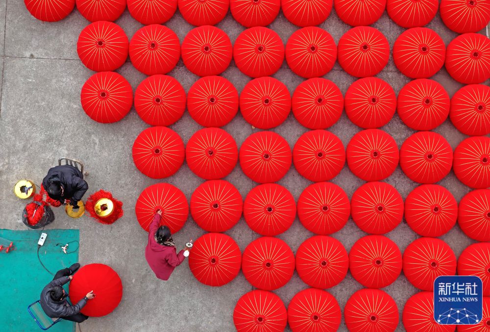 ↑ 1月21日,在浙江省臺(tái)州市仙居縣橫溪鎮(zhèn)一家燈籠加工作坊,工人趕制大紅燈籠(無人機(jī)照片)。新華社發(fā)(王華斌攝)